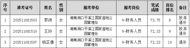 洞口县2025年部分事业单位公开招聘工作人员递补对象现场面试资格审查工作已于2025年12月5日12时结束,黎洲等1名考生放弃递补,根据《2025年洞口县部分事业单位公开招聘工作人员公告》规定,杨芷倩等1名考生入围面试资格审查,人员名单如下: