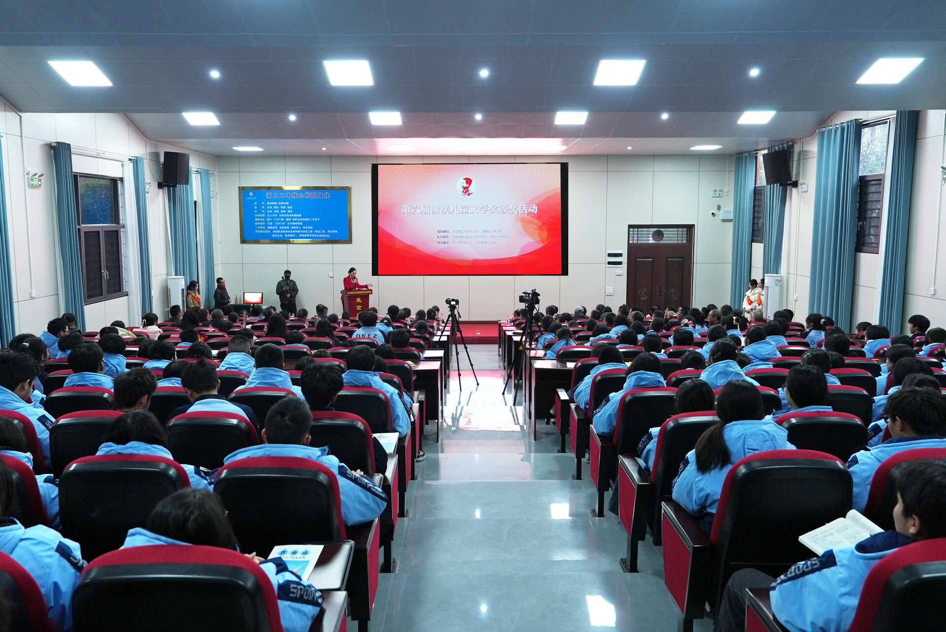洞口融媒12月23日讯(记者:胡海鹏 王哲 滕绍忻  通讯员:向佳丽)12月23日上午,第六届谢璞儿童文学奖颁奖活动在谢璞先生故乡——“中国雪峰蜜桔之乡”、中国作家“深入生活、扎根人民”新时代文学实践点洞口县举行,200余名文学界人士、嘉宾与师生代表欢聚在百年学府洞口县第二中学,共同见证了这一儿童文学盛事。