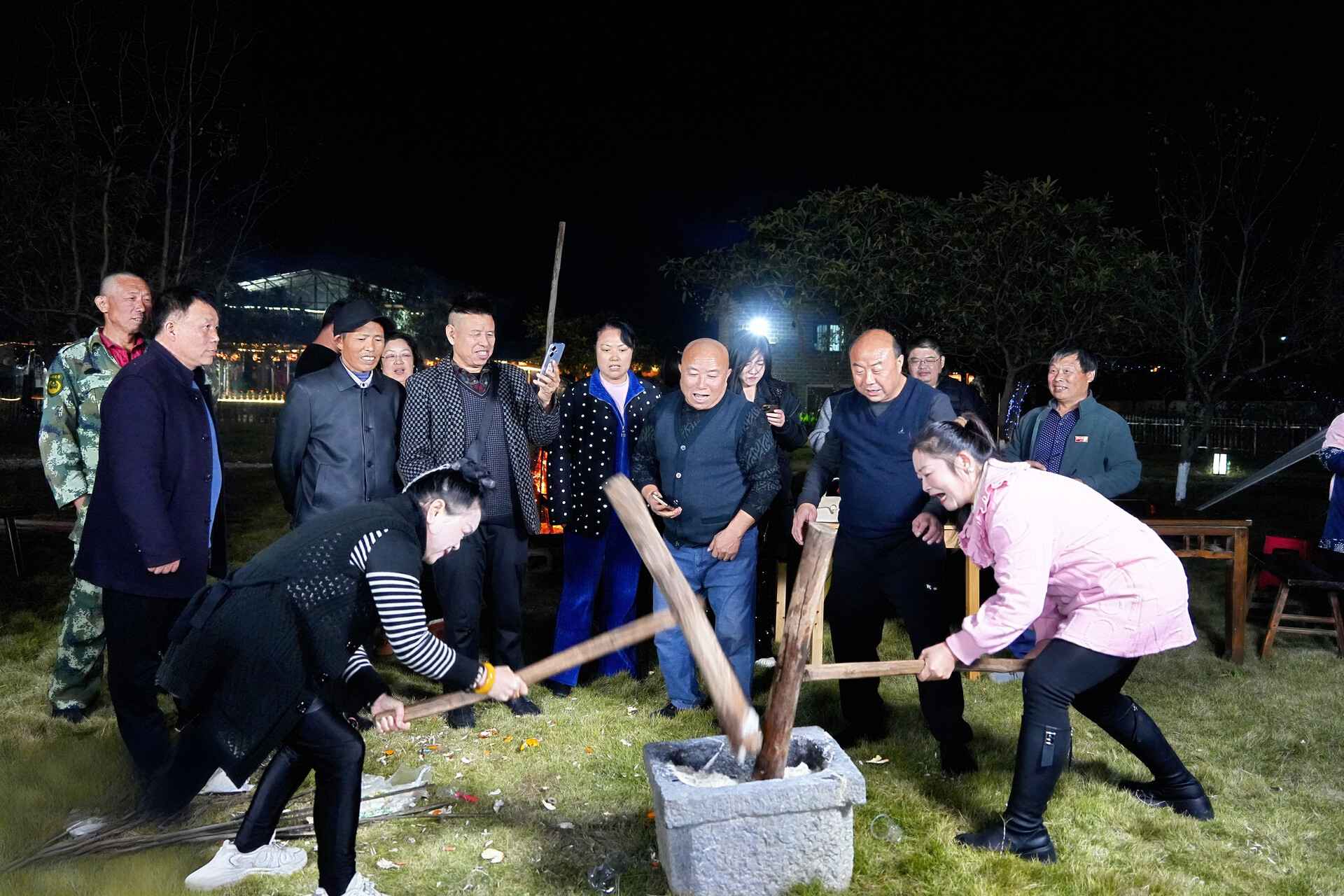 洞口融媒11月25日讯(记者:肖皓静)11月24日晚,文昌街道平青村的望龙山庄度假区,木槌撞击石臼的声响此起彼伏,熊熊篝火照亮了村民们的笑脸。一场热闹非凡的乡村篝火晚会暨打糍粑活动举行,村民与游客齐聚一堂,体验民俗乐趣,共话丰收喜悦。