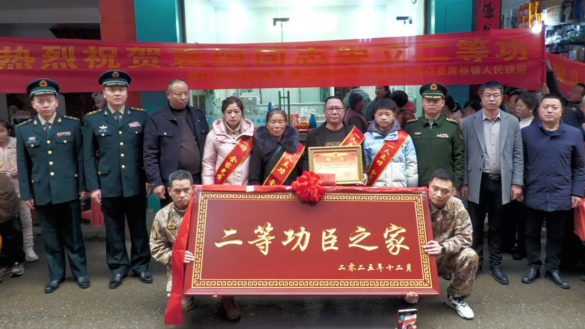 洞口融媒2月6日讯(记者:邓贝乐 通讯员:周后明2月6日,由县人武部、县退役军人事务局联合黄桥镇政府相关负责人组成慰问组,为荣立“二等功”的现役军人袁烜家属送上喜报。