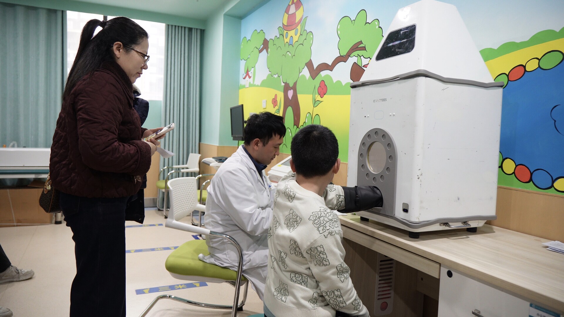 医院门诊大厅内排起了长队,医生正细致地为每一位孩子进行检查。在骨龄检测区,医生通过骨龄仪为孩子进行骨龄评估,并现场为家长解读报告,科学评估孩子的生长发育水平及身高潜力,提供个性化的干预指导。在视力筛查区,医护人员为孩子们仔细检查视力状况,排查潜在问题,针对春季开学后用眼负担加重的情况,医生们还现场向孩子们传授了科学用眼、预防近视的知识,叮嘱大家增加户外活动、减少电子产品使用时间。
