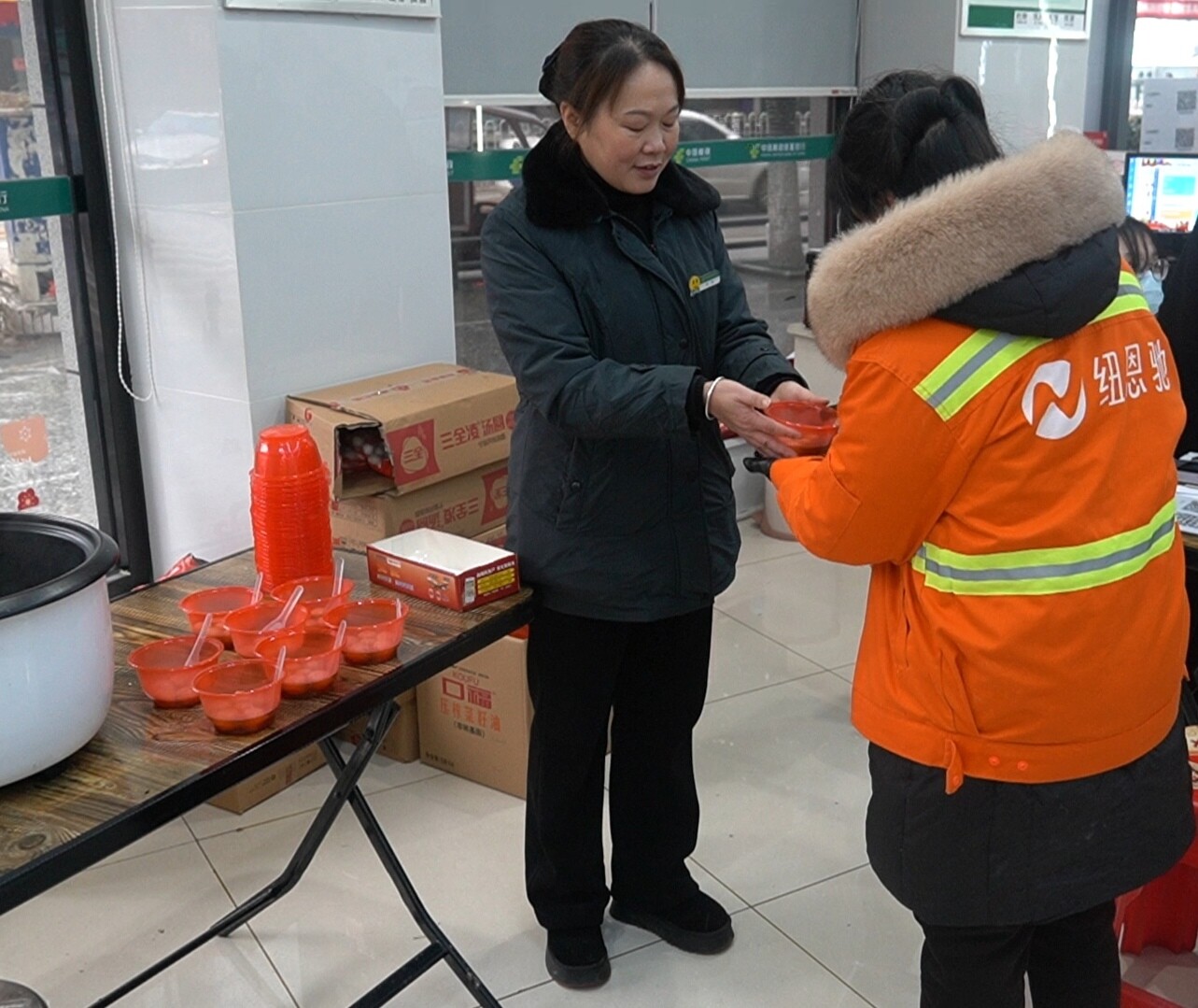 活动当天,洞口邮政网点门前暖意融融,刚刚完成一轮路面清扫工作的环卫工人们受邀走进网点内的“爱心驿站”休息区,这里窗明几净,热茶水供应充足,舒适的座椅让疲惫的身体得以片刻放松。工作人员早已准备好锅碗瓢盆,现场煮起了象征着团圆与甜蜜的汤圆,不一会儿,一碗碗热气腾腾、软糯香甜的汤圆便送到了环卫工人的手中。工作人员一边递上汤圆,一边与环卫工人们亲切交谈,感谢他们为城市整洁环境付出的辛劳。接过汤圆的环卫工人们脸上洋溢着感动的笑容,纷纷称赞邮政的贴心之举。