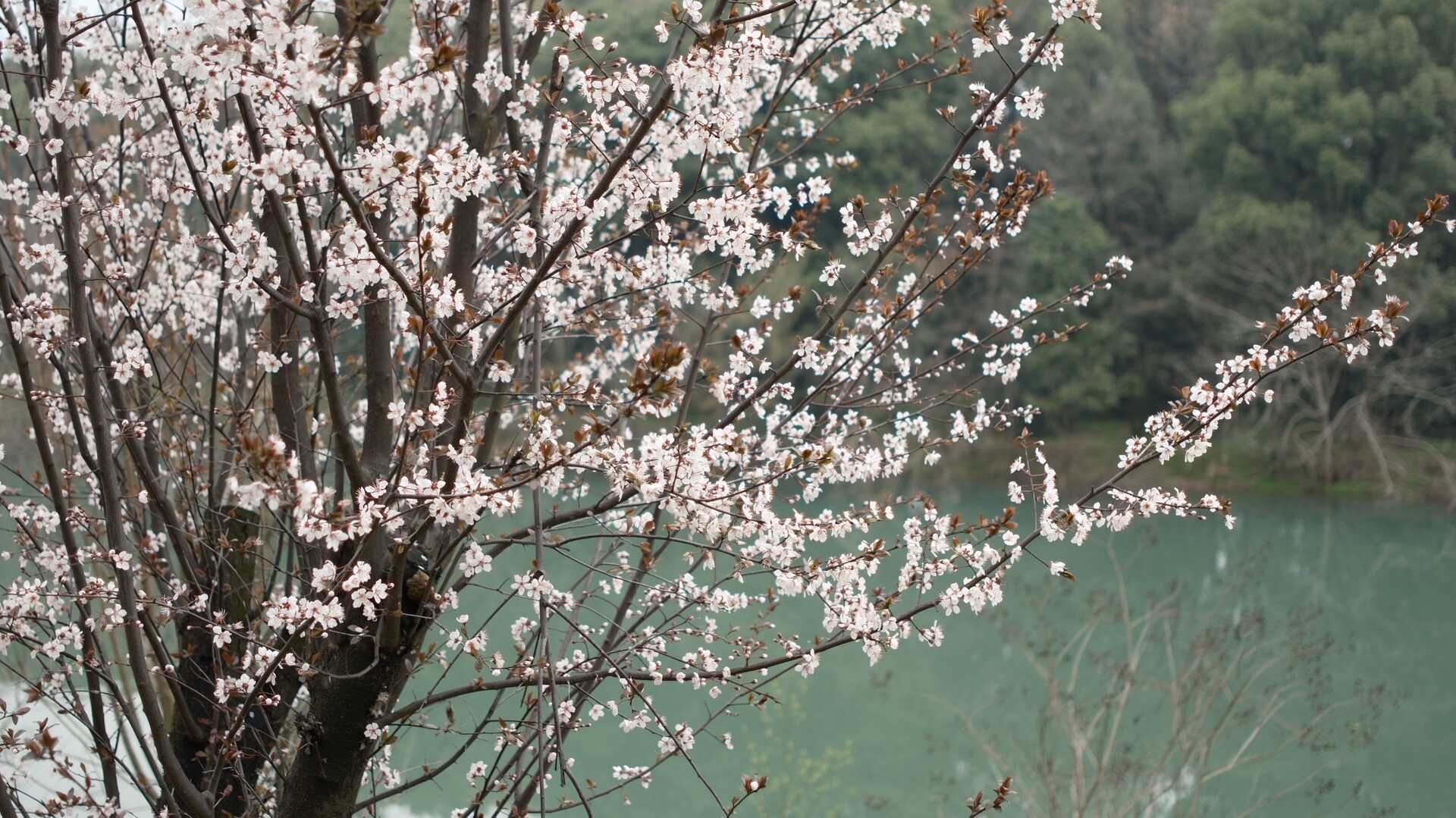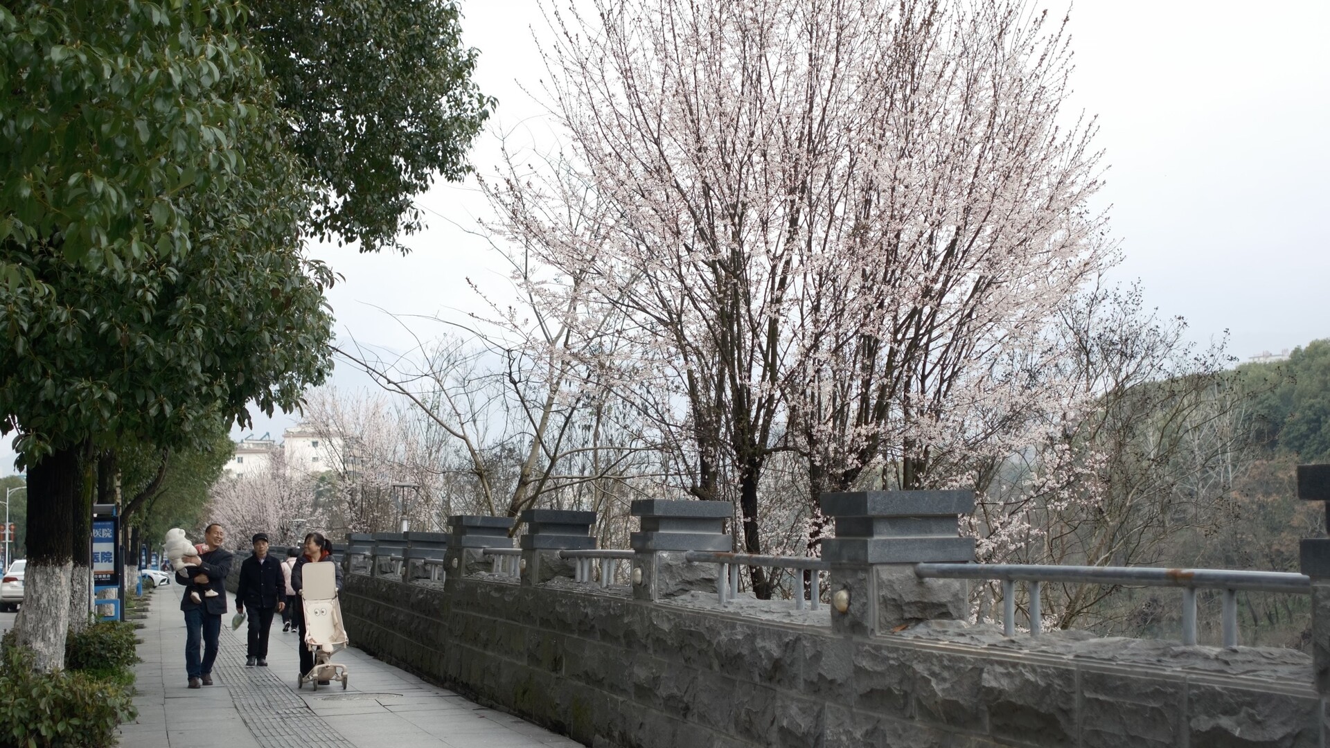 在县城蔡锷大桥沿江风光带,粉白相间的紫叶李花缀满枝头,一丛丛、一簇簇连成白色花浪。远观如薄雾云霞,轻盈铺展在抽芽的枝丫间;近看花瓣纤薄精致,沾着露珠随风轻颤,淡雅花香沿路飘散,吸引不少市民前来漫步赏花、拍照留念。