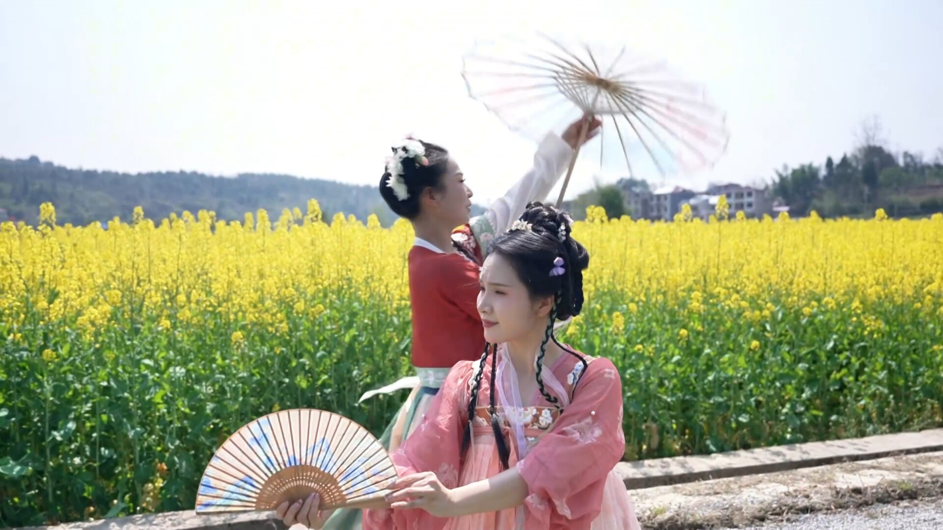 游客杨茜说:“春天油菜花全开了,一片金黄特别好看,穿着汉服来拍照打卡,感觉很有氛围感,风景美、心情好,也特别的出片!”