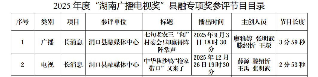 按照《2025年度“湖南广播电视奖”县融专项奖评选》要求,现推荐我单位2篇作品参加2025年度“湖南广播电视奖”县融专项奖评选,现予公示,接受群众评议监督。