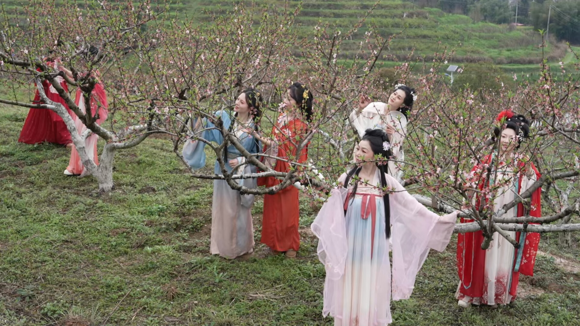 走进桃林,各色桃花缀满枝头,微风拂过,花瓣轻舞,花香与茶香交织弥漫。身着飘逸汉服、典雅旗袍的游客穿梭其间,或执扇漫步,或驻足留影,衣袂翩跹与灼灼桃花相映,尽显古韵雅致,成为花海中一道靓丽的风景线。