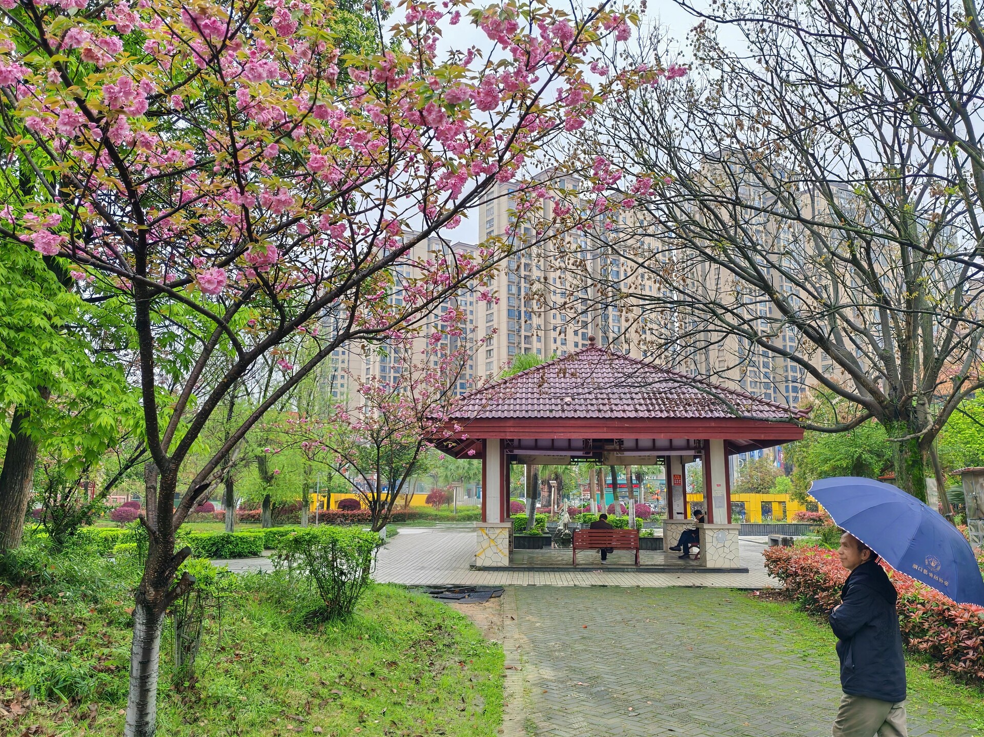 记者在现场看到,晚樱花团紧凑饱满,沉甸甸的花枝随风轻颤,远观如粉色云海笼罩街巷。樱花一侧的凉亭里,不少市民正在休憩闲聊,几位乐器爱好者还即兴吹奏起萨克斯,悠扬的旋律与簌簌落花相映成趣,为这幅春日城市画卷增添了灵动的生活气息。朵朵樱花与周边的现代建筑、城市道路相映成趣,绘就一幅独具特色的春日城市画卷。