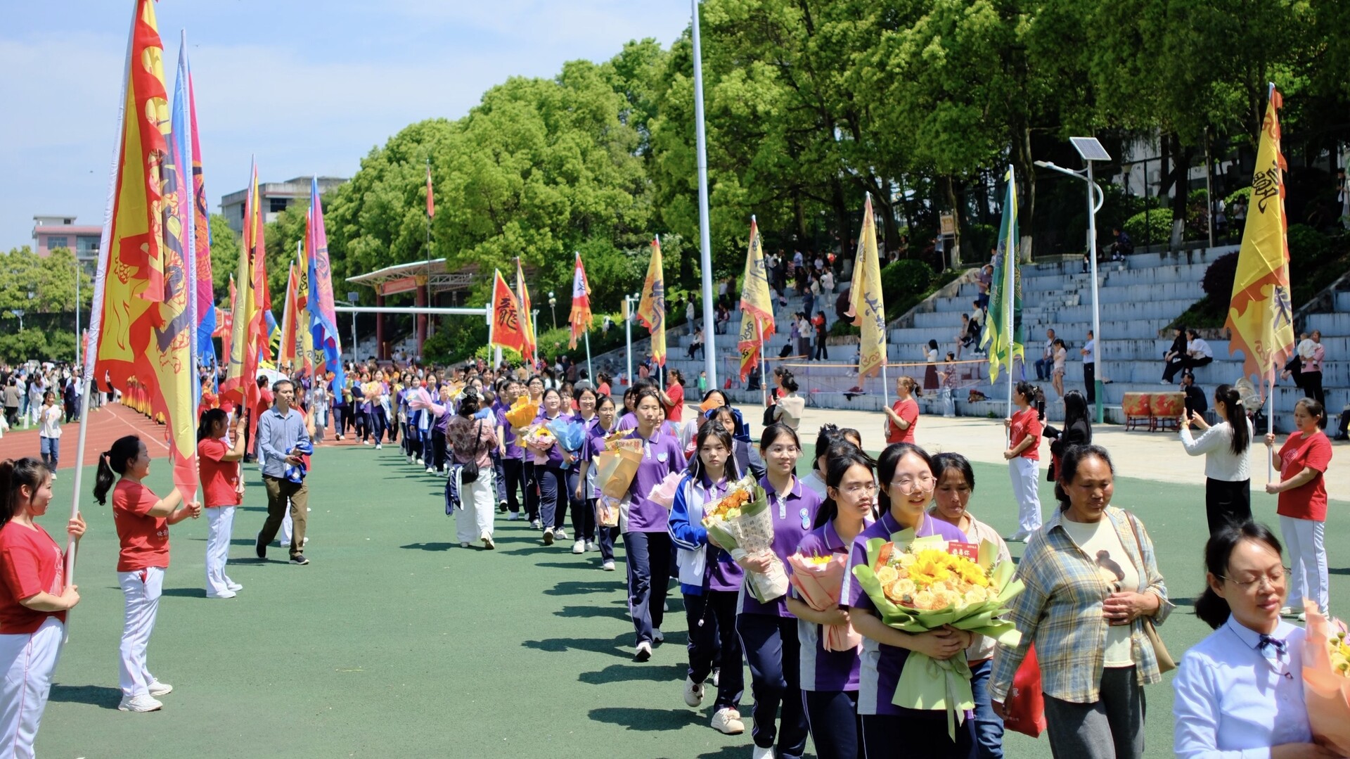 仪式后,学子们携手家长依次穿过成人门、成才门、成功门与榴龙门,在签名墙上郑重留下青春印记。家长们手捧鲜花,为即将踏上高考冲刺之路的孩子送上祝福。