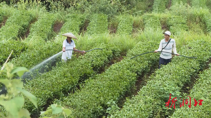 在湖南古楼雪峰云雾茶有限公司海拔600多米的高山茶园,该公司采取“三级提水”的方式,在茶园山脚、半山腰和山顶分别修建蓄水池,利用水泵从地面以下50米处的河中抽水到茶园山脚蓄水池,再从山脚到山腰,从山腰到山顶,一共三级提水。茶农们分成5个抗旱小组,每天早上6点开始引水浇灌茶树。同时,利用水肥一体化喷灌系统定时喷灌,实现了茶园精准抗旱。