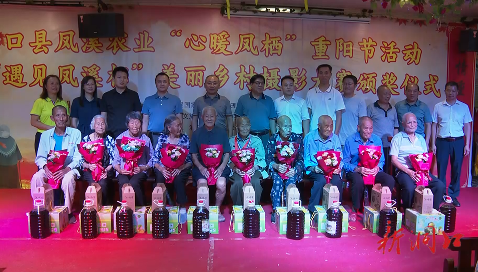 10月4日是一年一度的重阳节,洞口县凤溪农业生态科技有限公司举行“心暖凤栖”重阳节活动暨“遇见凤溪杯”美丽乡村摄影大赛颁奖仪式,摆下“长寿宴”,宴请该村16位90岁以上的老人,这是该公司连续3年宴请全村耄耋老人,其中年龄最大的是抗战老兵王英期,今年已经97岁高龄。中午12时,长寿宴正式开席,十个热菜、两道汤、点心陆续上桌。寿宴的菜品专门为老人设计,以清淡易嚼易消化为主。期间,还安排了丰富多彩的文艺节目,并为每位老人赠送了礼物和鲜花,让老人们不仅饱了口福,也饱了眼福。