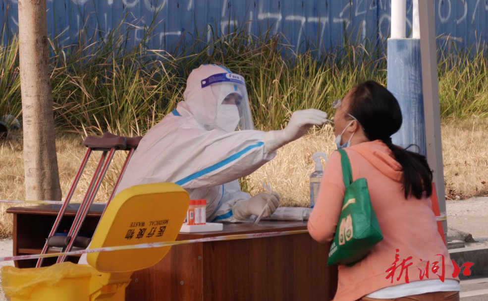 11月1日一大早,肖金凡就赶到洞口经开区核酸采样点,拄着拐杖走上工作岗位。这是他带伤参加核酸采样工作的第三天。