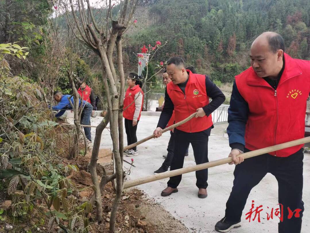 挥锹铲土、扶直树苗,培实新土、交流经验……志愿者们有条不紊,分工协作,植树现场洋溢着团结协作、昂扬向上的浓厚氛围。山上映山红,山下志愿红。一排排新植的映山红树苗间流动着“志愿红”,红绿相映,茶乡古楼的春日山林生机盎然。