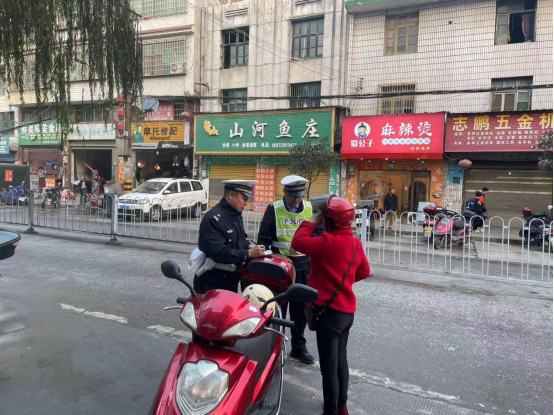 参加行动的全体人员分成三个执法小组在里仁小学、市镇小学、五七中学附近路口设置执勤点,重点查处摩托车、电动车骑乘人员不戴头盔,以及街道车辆乱停乱摆行为。同时,开展面对面交通安全宣传教育,引导广大交通参与者牢固树立遵规守法的交通安全理念,确保安全出行。